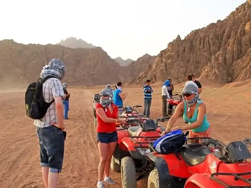Prepare for an exhilarating 5-hour adventure through the stunning desert sands and mountains. The experience begins with a short introduction on how to ride a quad bike. Each quad bike is equipped with an easy-to-use automatic control system, allowing you to focus on enjoying the ride. After a brief instructional session, you’ll be ready to navigate the desert terrain, and a special scarf will be provided to protect your face from the sand.